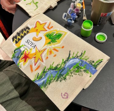 Participants were provided with simple cotton bags and a wide selection of art supplies, from fabric paints and stencils to embroidery threads and patches. Guided by their creativity and tutorials, everyone had the opportunity to create their own design and personalize their bag, transforming a simple accessory into a unique work of art.